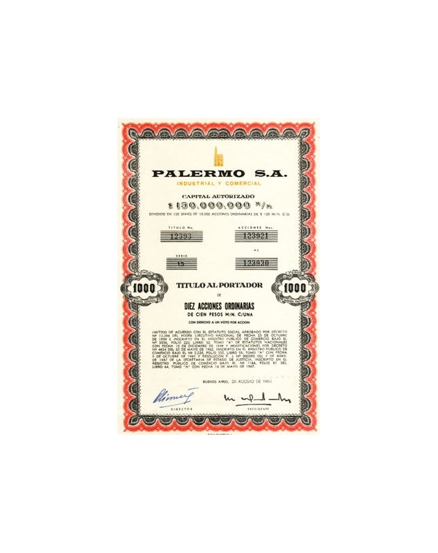 Titre de 10 Actions Ordinaires de 100 Pesos chacune - Buenos Aires 1967