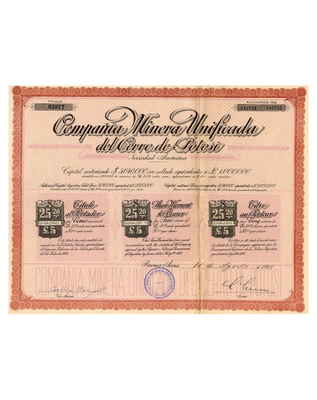 Titre de 5 actions d'1£ chacune, équivalent à 5£ - Buenos Aires 1931