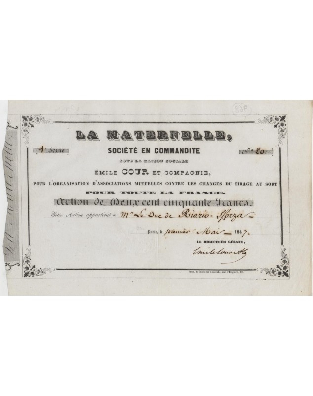 Action de 250 francs 1ère série émise au nom de M. Le Duc de Riario-Lforza à Paris, en 1847.