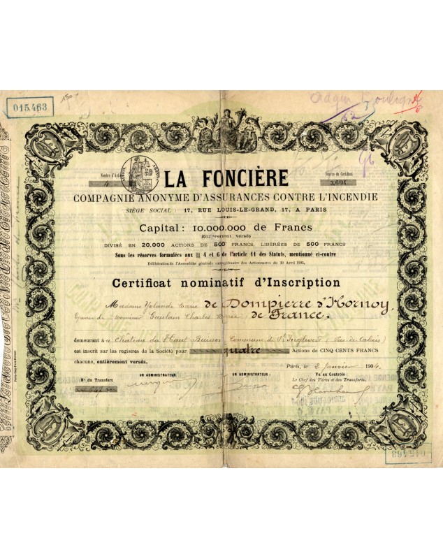 Certificat nominatif de 4 actions de 500F chacune - Paris 1904