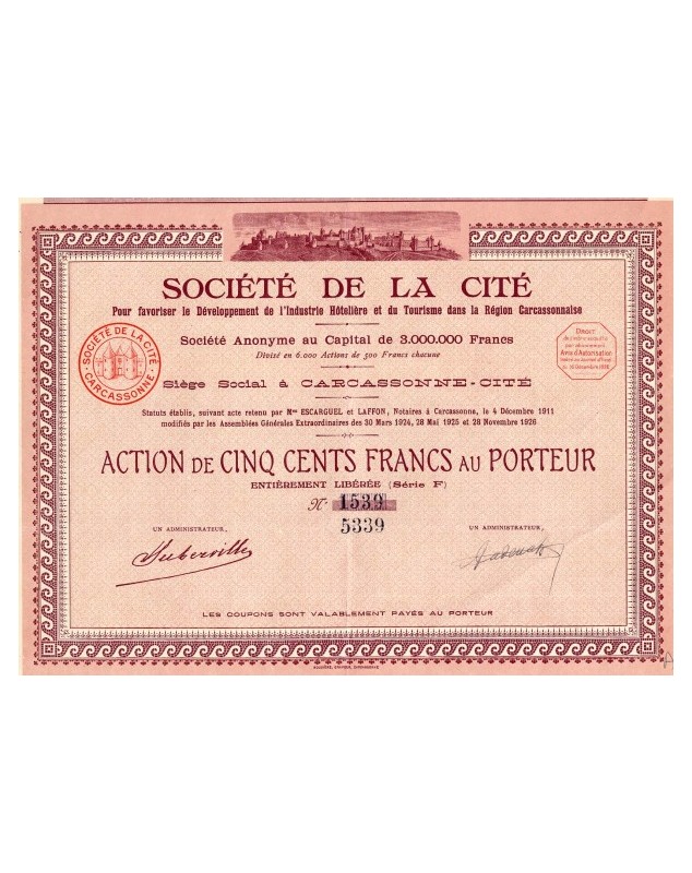 Action de 500 francs au porteur émise à Carcassonne-Cité en 1926.