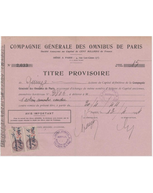 Titre provisoire de 15 Actions - Paris 1944