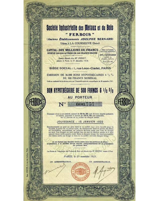 Bon hypothécaire à 6,5% de 500 francs au porteur émis à Paris en 1922.