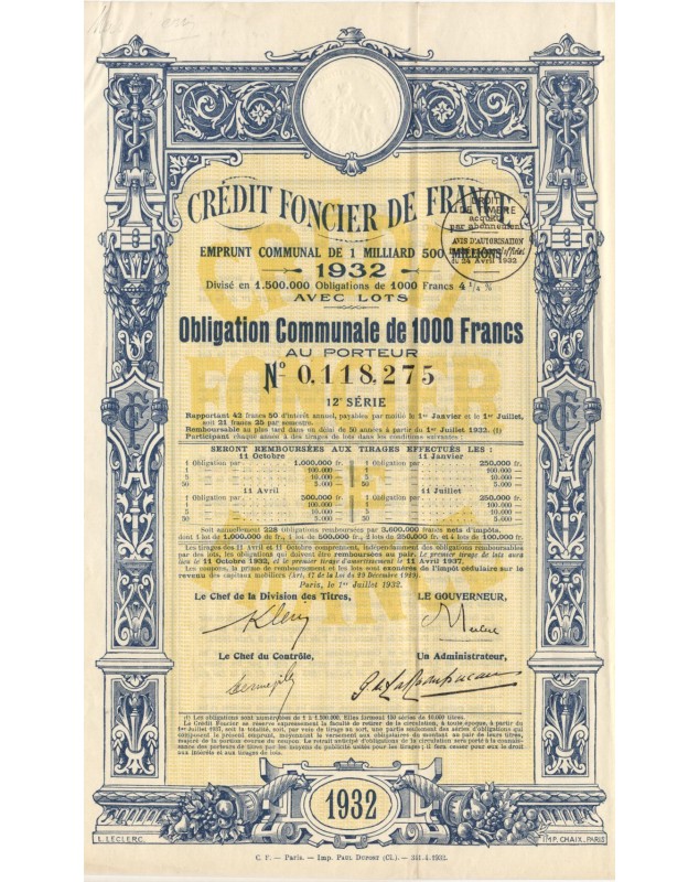 Crédit Foncier de France - Emprunt Communal de 1,5 Milliard 1932