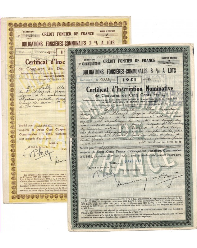 Crédit Foncier de France - Lot de 2 Obligations Foncières Communales 1949