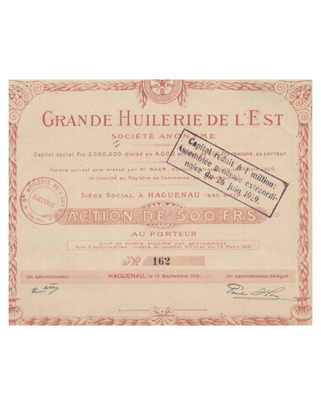 Action de 500 francs au porteur émise à Haguenau (Bas-Rhin) en 1921.
