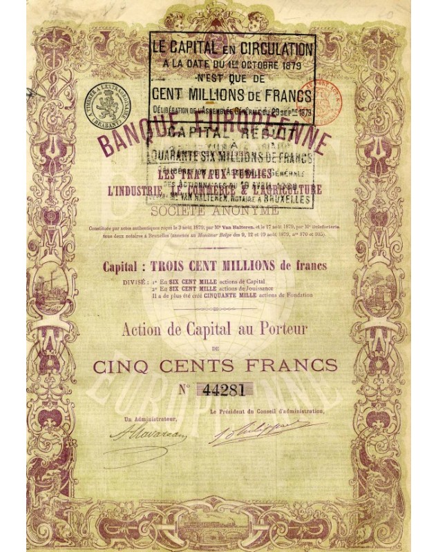 Action de Capital de 500F - Bruxelles 1879