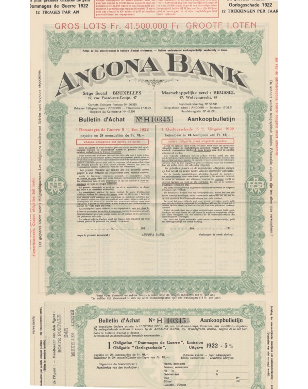 Obligation ''Dommages de Guerre'', Em. 1922 5% - Bruxelles