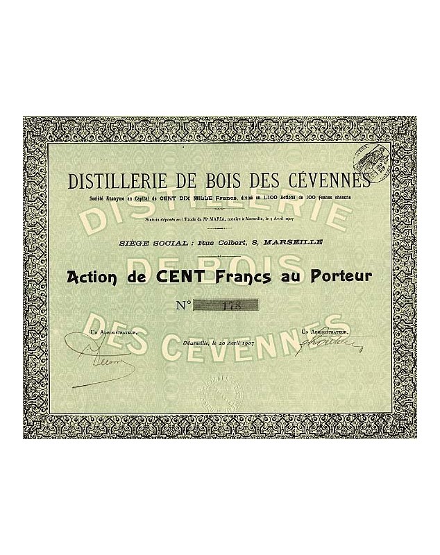 Action de 100 francs émise à Marseille (rue Colbert) en 1907.