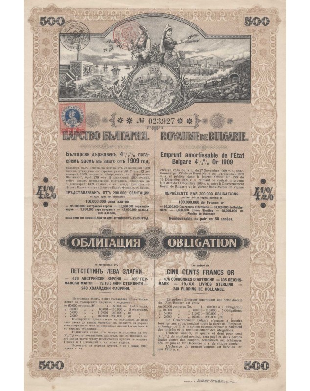 Royaume de Bulgarie - Emprunt de l'Etat Bulgare 4,5% Or 1909. 500F