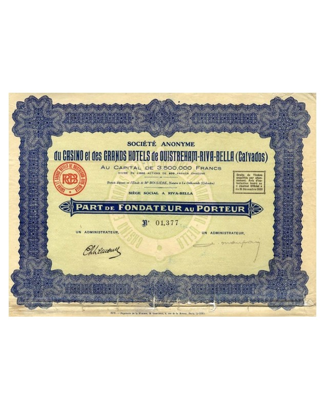 Part de Fondateur émise à Riva-Bella (Calvados) en 1930.