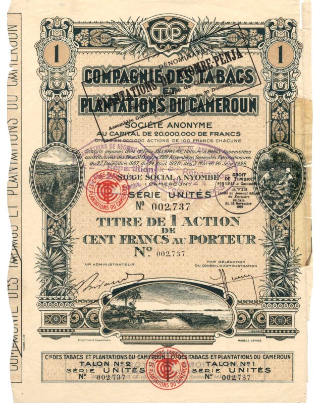 Titre d'1 action de 100 francs au porteur émise à Nyombé (Cameroun) en 1929.
