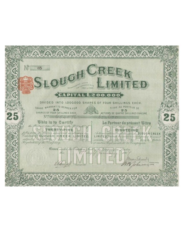 Titre de 25 Actions de 4 Shillings chacune - Londres 1907