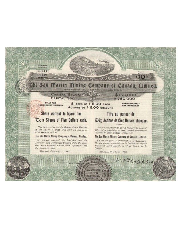 Titre de 10 Actions de 5$ chacune - Montréal 1913
