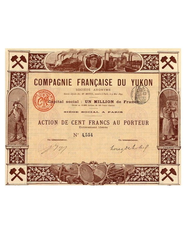 Action de 100 francs au porteur émise à Paris en 1899, à l'époque de la ruée vers l'or dans le Klondyke, au Canada. Les prospecteurs avaient commencé à chercher de l'or dans le Yukon dès les années 1880. Près de 10 000 des prospecteurs qui arrivent au Yukon entre 1897 et 1899 après la découverte d'alluvions en 1896 étaient des Canadiens français. Ce phénomène mena à l’établissement de Dawson City, en 1896, et, par la suite, du Territoire du Yukon, en 1898.