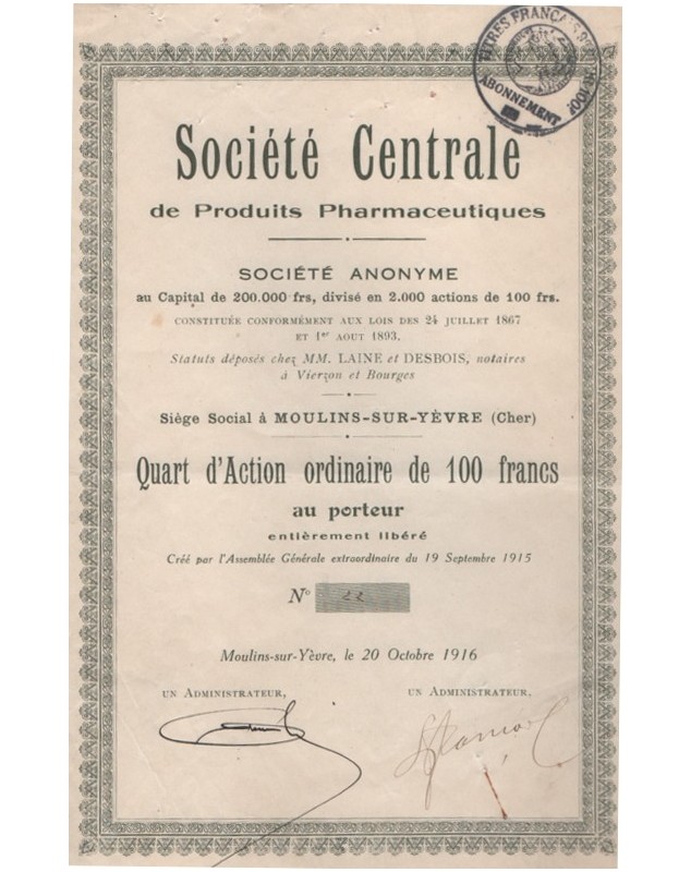 Quart d'Actions de 100F - Moulins-Sur-Yèvre (Cher) 1916.