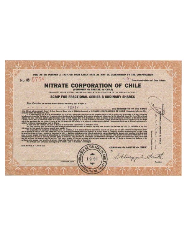Certificat fractionnaire d'Action ordinaire, série B - New-york 1931