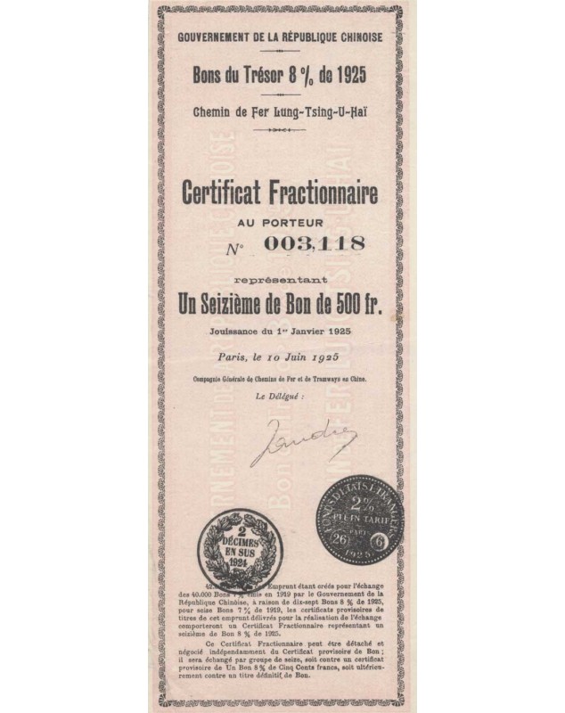 Chemin de Fer de Lung-Tsing-U-Hai - Gouvernement de la République Chinoise - Bons du Trésor 8% 1925