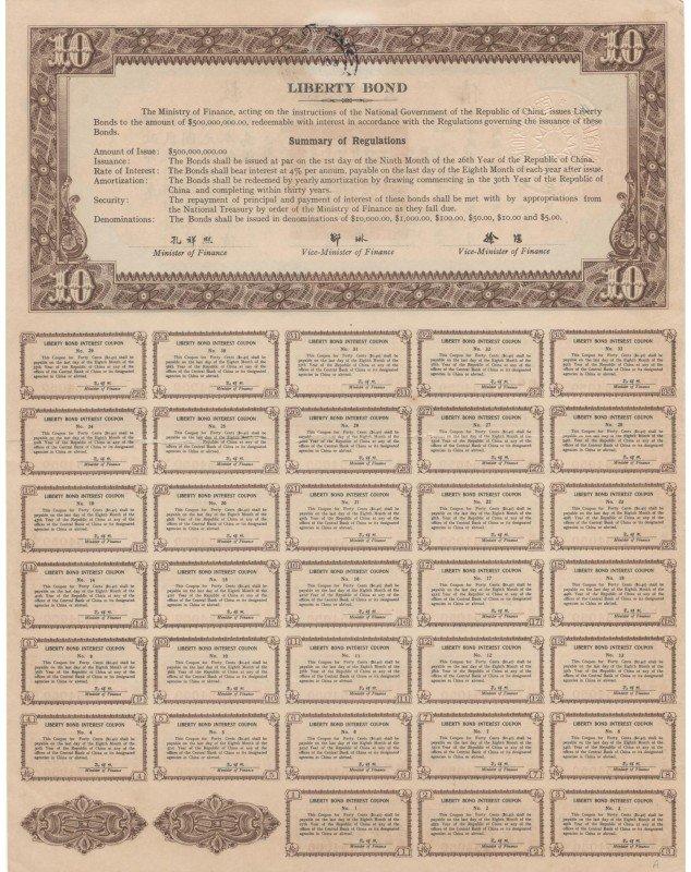 Obligation de 10$ - 26ème année de la République de Chine (1937)