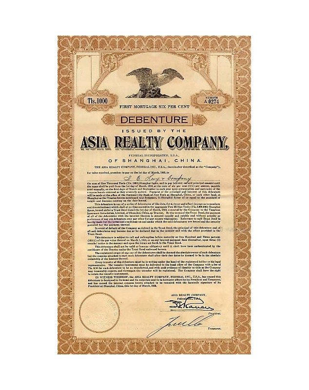 Obligation de 6% de première hypothèque de 1.000 Taels - Shanghaï 1930.