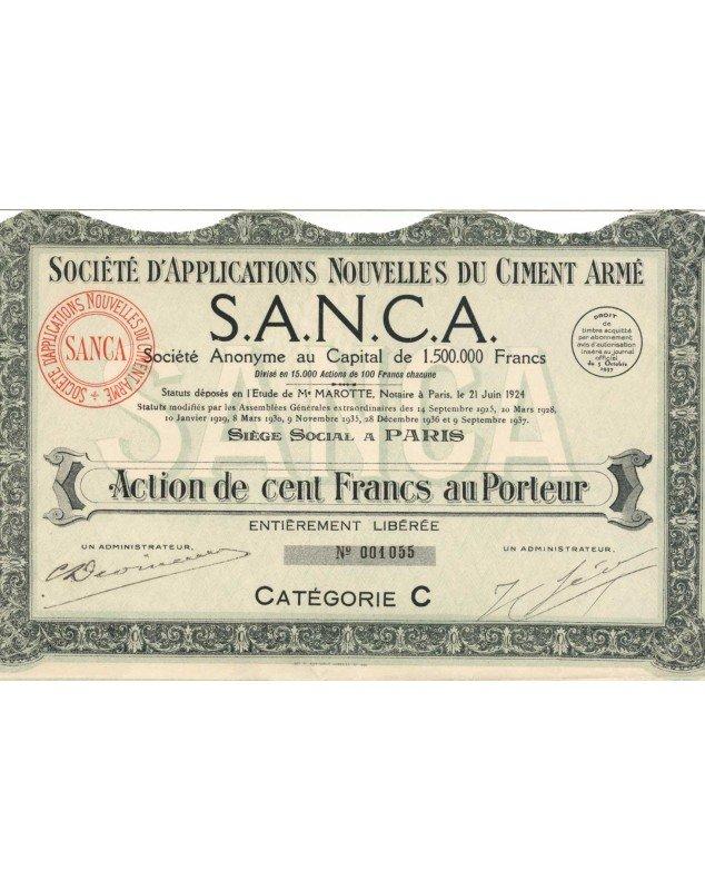 Lot de deux actions de la société SANCA de 100F émises à Paris en 1930 et 1937.