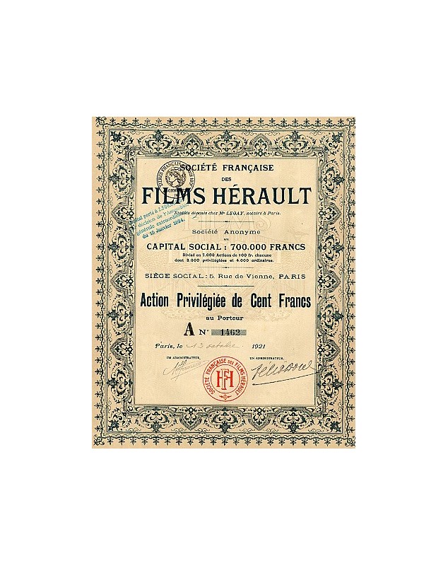 Action privilégiée de 100 francs au porteur émise à Paris en 1921.