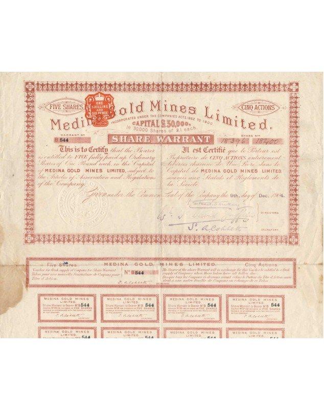 Certificat de 5 actions ordinaires d'1£ émis en 1904.