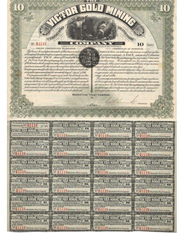 Certificat de 10 actions de 5$ chacune émis dans l'Etat du Colorado en 1896.