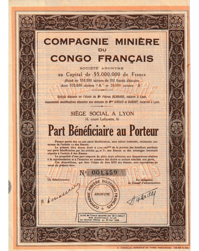 Part Bénéficiaire au porteur émise à Lyon en 1933.