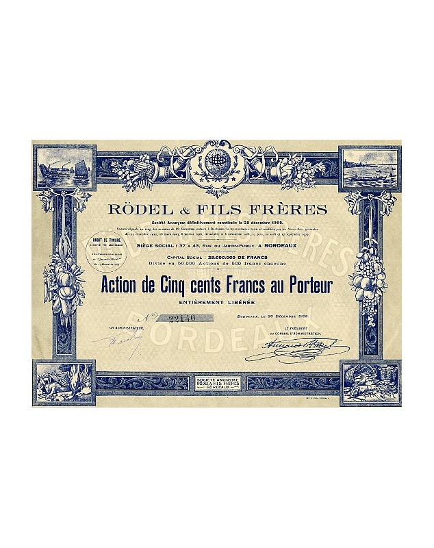 Action de 500 francs au porteur émise à Bordeaux en 1929. Signée par Rödel.