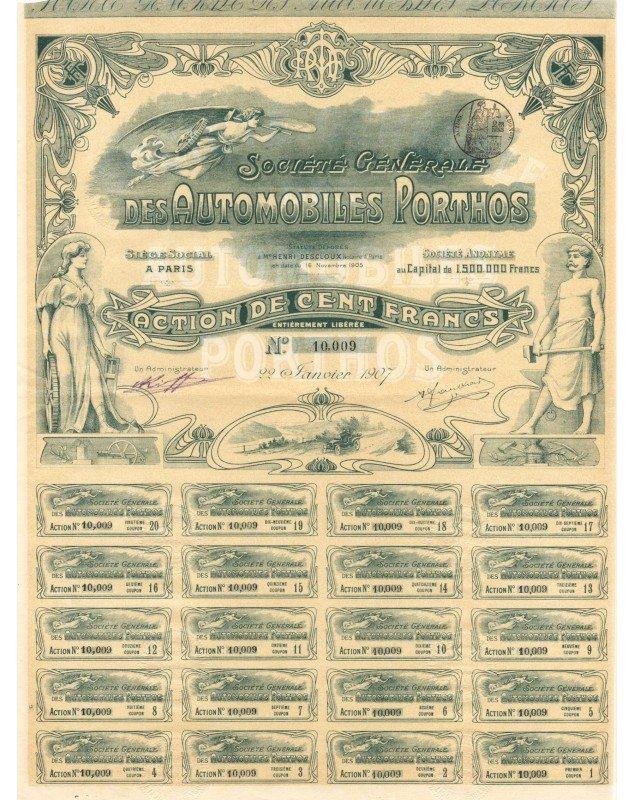 Action de 100 francs au porteur émise à Paris en 1907 par la Société Générale des Automobiles Porthos, fondée en 1905 à Billancourt (12 rue du Dôme). La société fabriquait des voitures de luxe. La société fut dissoute à l'approche de la première guerre mondiale.