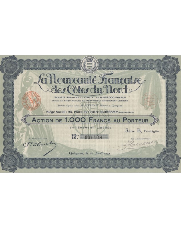 Action de 1000 francs au porteur émise à Guingamp (siège social 25 Place du Centre) en 1929.