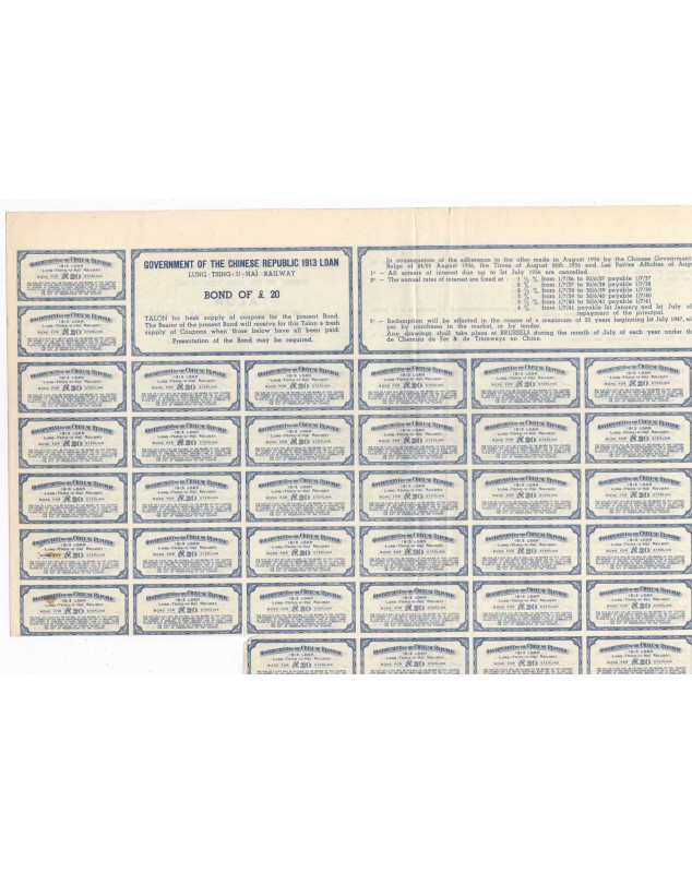Une feuille de coupons seuls correspondant à une obligation 5% Or (surnommée "Super Petchili") de 20£ datée de 1913 (Bruxelles).