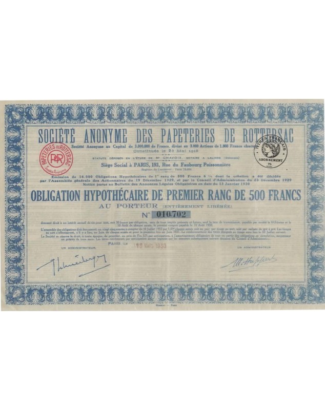 Obligation Hypothécaire de 1er rang de 500F - Paris/Lalinde 1930