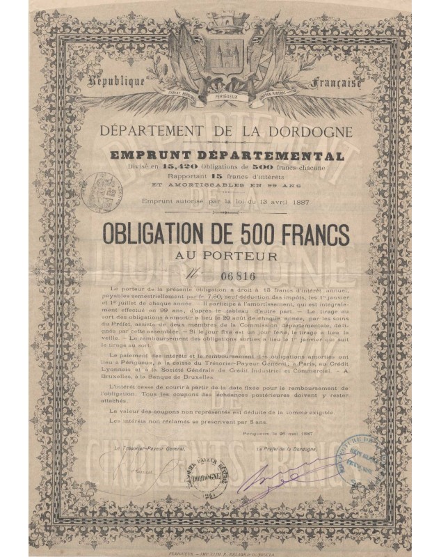 Obligation de 500F - Périgueux 1887