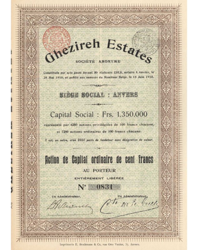 Action de 100 francs au porteur émise à Anvers en 1910.