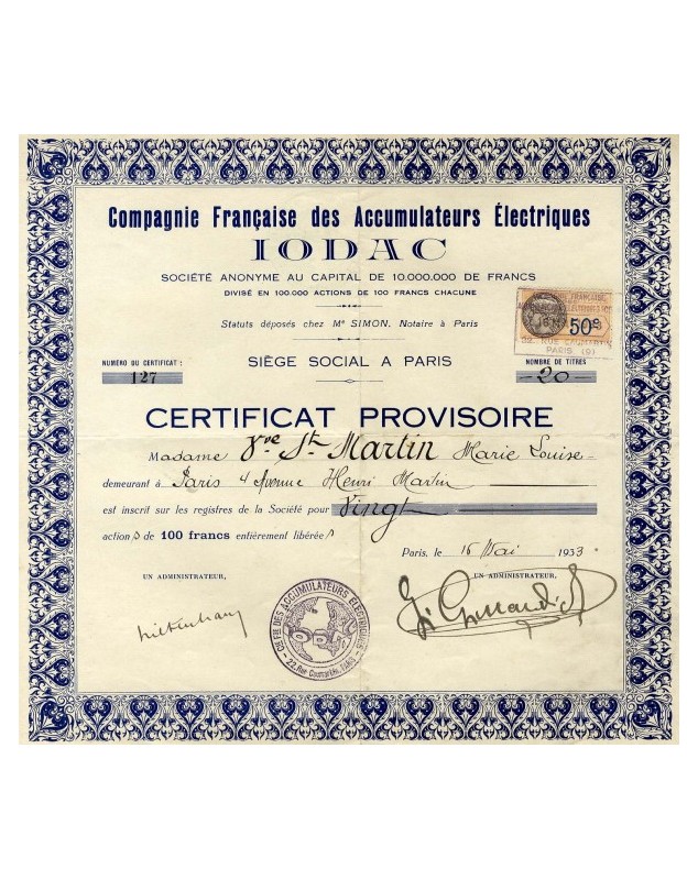 Cert. provisoire de 20 Actions de 100F - Paris 1933
