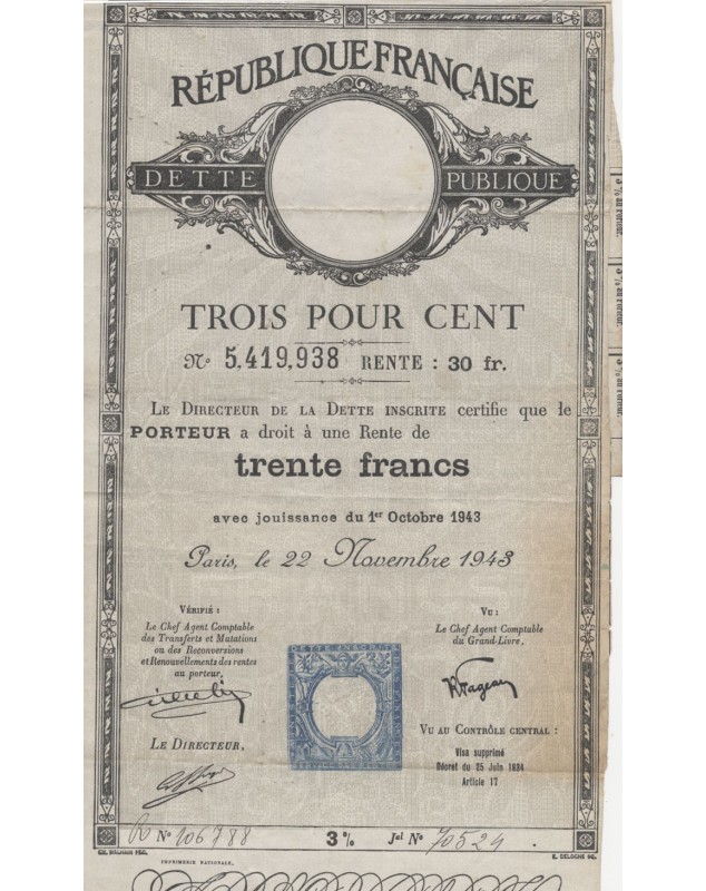 Certificat de rente de 30F - Paris 1934 ou 1943