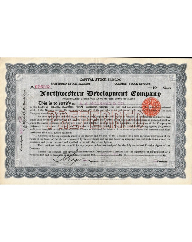 Titre de 10 Actions préférentielles de 5$ chacune - Maine 1907