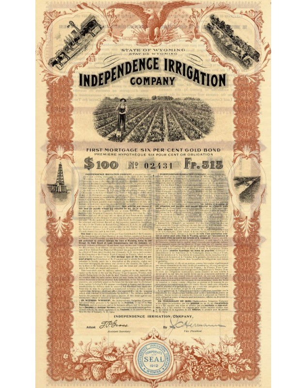 Obligation Or de Première hypothèque 6% de 100$ ou 515F - Etat du Wyoming 1914