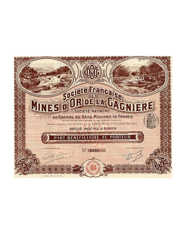 Extrait des statuts au dos du titre : "ma société a pour objet (...) la recherche dans les départements de l'Ardèche et du Gard (..) de mines et de gisements miniers. (...) Apport de M. Robert Forget des bénéfices de de la demande de concession des mines de mispickel, or, argent et autres métaux précieux (...).