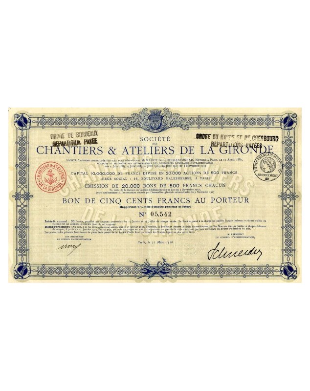 Bon de 500F émis à Paris en 1918.