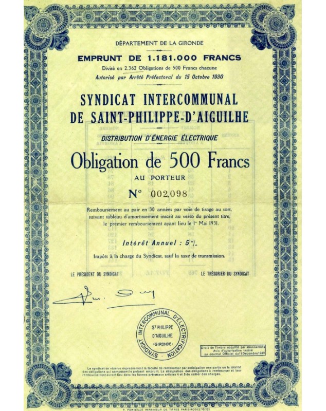 Oblig. de 500F - Département de la Gironde 1930