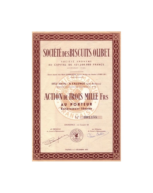 Société de fabrication de biscuits fondée en 1860 par Jean-Honoré Olibet. Usine à Suresnes.