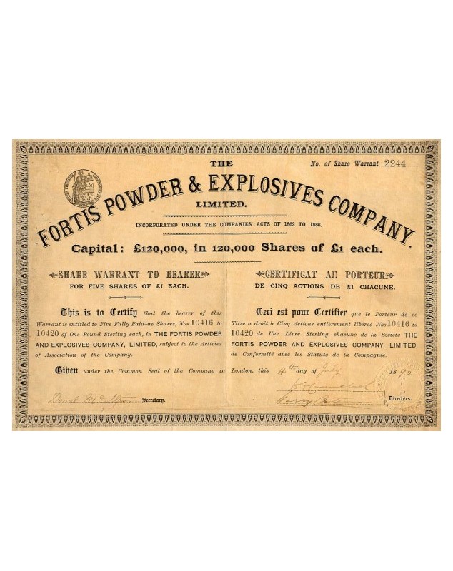 Titre de 5 Actions d'1£ chacune émis à Londres en 1890 par la Compagnie des poudres et explosifs Fortis.