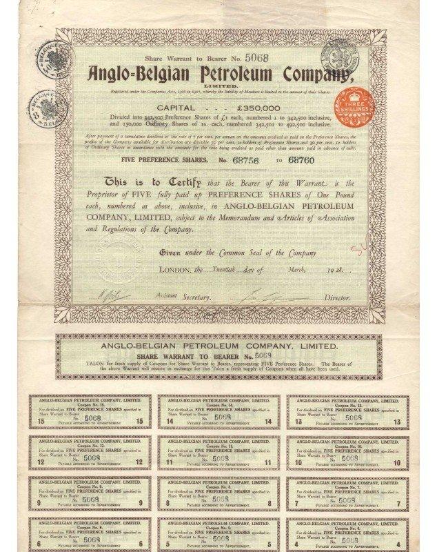 Titre de 5 Actions d'1£ privilégiées au porteur émis à Londres en 1928.