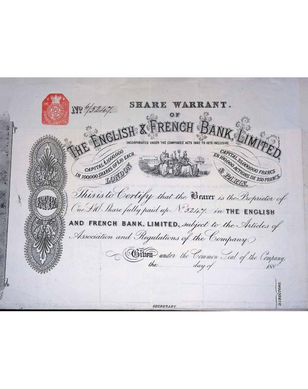The English and French Bank Limited est une institution financière fondée au début du XXᵉ siècle, illustrant la coopération économique entre capitaux britanniques et français dans un contexte de forte expansion des échanges internationaux. Cette banque avait pour vocation de faciliter les opérations commerciales et financières entre les deux pays, ainsi que d’accompagner les investissements à l’étranger, notamment dans les colonies et les zones en développement. Active durant une période marquée par d’importantes mutations économiques et par les tensions précédant la Première Guerre mondiale, elle s’inscrit dans l’histoire des établissements financiers internationaux aujourd’hui disparus ou absorbés. De nos jours, The English and French Bank Limited est connue des collectionneurs à travers ses titres anciens, recherchés en scripophilie pour leur élégance graphique et leur intérêt historique, témoins d’une époque clé de la mondialisation financière.