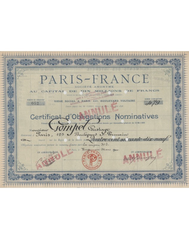 Le célèbre artiste de l'Art Nouveau Alphonse Mucha, ami du directeur, illustre en 1917 une série de titres de la société Paris-France, avec de charmantes jeunes femmes évanescentes, incarnant l'Industrie, l'Agriculture, le Commerce et la Science. Ces titres font partie des plus célèbres et des plus beaux de la scripophilie.