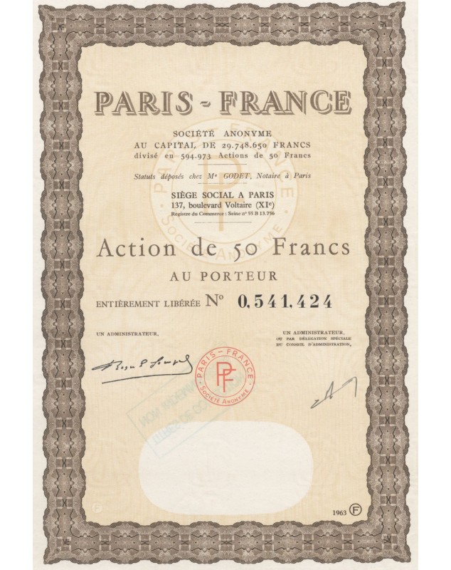 Action au porteur de 50 francs émis à Paris en 1963. Avec tampons au dos du titre : "Titres de collection, non indemnisables".
