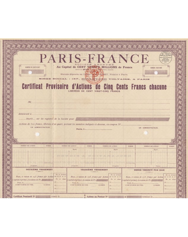 Le célèbre artiste de l'Art Nouveau Alphonse Mucha, ami du directeur, illustre en 1917 une série de titres de la société Paris-France, avec de charmantes jeunes femmes évanescentes, incarnant l'Industrie, l'Agriculture, le Commerce et la Science. Ces titres font partie des plus célèbres et des plus beaux de la scripophilie.